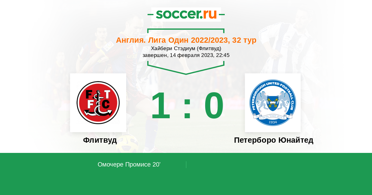 Англия. Первая Футбольная Лига 13.09.2022 Петерборо Юнайтед Логотип футбольный клуб Петерборо Юнайтед 0:1 Логотип футбольный клуб Флитвуд Флитвуд