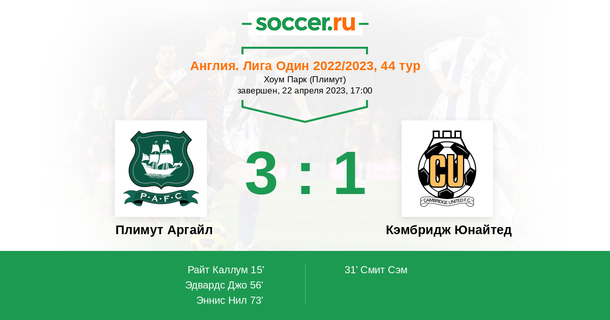 Англия. Первая Футбольная Лига 22.02.2022 Кэмбридж Юнайтед Логотип футбольный клуб Кэмбридж Юнайтед 2:0 Логотип футбольный клуб Плимут Аргайл Плимут Аргайл
