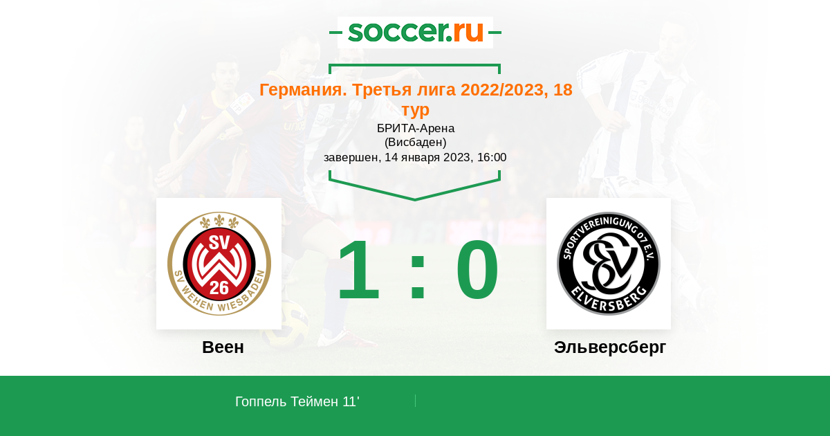 Германия. Бундеслига 2 23.09.2023 Веен Логотип футбольный клуб Веен (Висбаден) 0:2 Логотип футбольный клуб Эльверсберг (Саарбрюкен) Эльверсберг