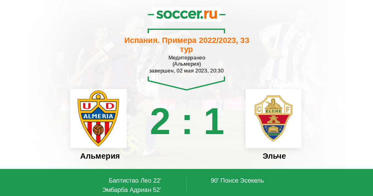 Испания. Сегунда 28.04.2017 Эльче Логотип футбольный клуб Эльче 2:3 Логотип футбольный клуб Альмерия Альмерия