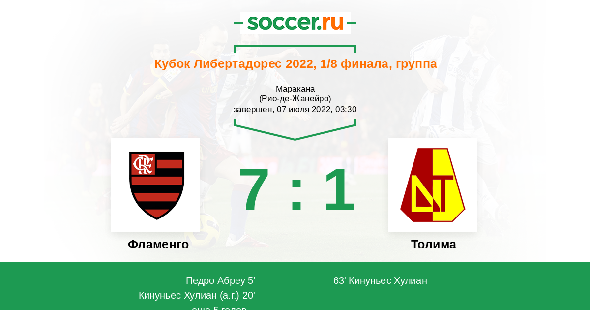 В первой игре между этими соперниками Фламенго в гостях одержал победу со счётом 1-0, но в этой игре им просто фантастически везло, Депортес Толима забили уже на 7 минуте, но этот гол отменили, а так команда вообще играла первым номером и смотрелась очень даже неплохо, но как говорится не сложилось. Фламенго дома играет на много агрессивнее, гости вынуждены будут бежать вперед, а хозяева их должны ловить на контратаках. Удачи