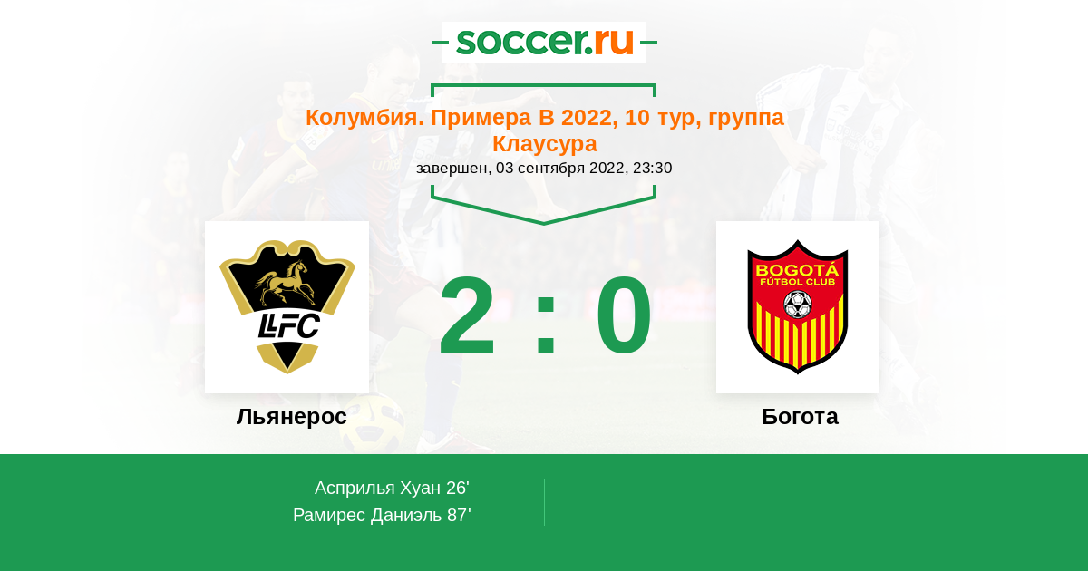 Колумбия. Примера B 28.09.2014 Льянерос Логотип футбольный клуб Льянерос (Вильявисенсио) 4:1 Логотип футбольный клуб Богота Богота