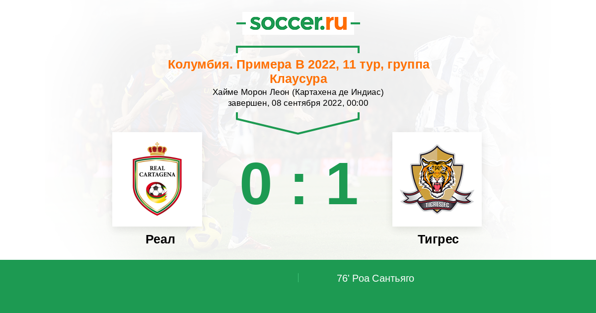 Колумбия. Примера B 11.09.2016 Реал Логотип футбольный клуб Реал (Картахена) 2:1 Логотип футбольный клуб Тигрес (Сипакира) Тигрес