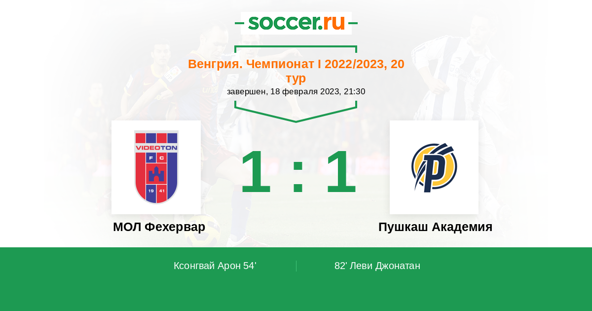 Венгрия. Чемпионат 1 14.03.2021 Пушкаш Академия Логотип футбольный клуб Пушкаш Академия (Фелксут) 1:0 Логотип футбольный клуб МОЛ Фехервар (Секешфехервар) МОЛ Фехервар