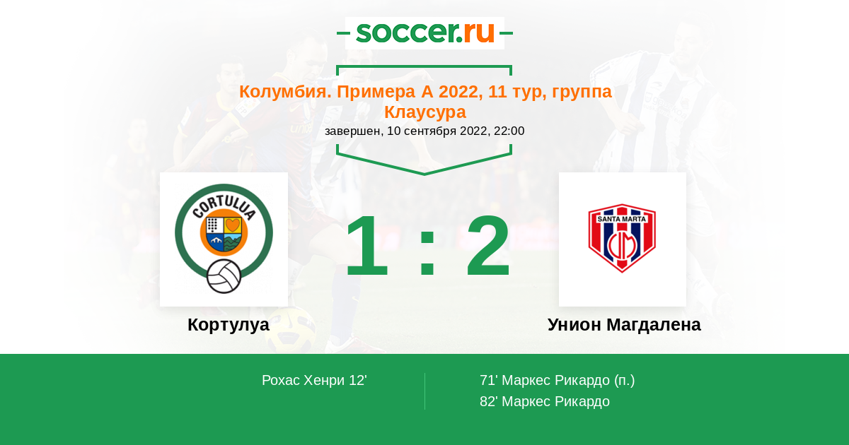 Колумбия. Примера А 19.03.2022 Унион Магдалена Логотип футбольный клуб Унион Магдалена (Санта Марта) 0:2 Логотип футбольный клуб Кортулуа Кортулуа
