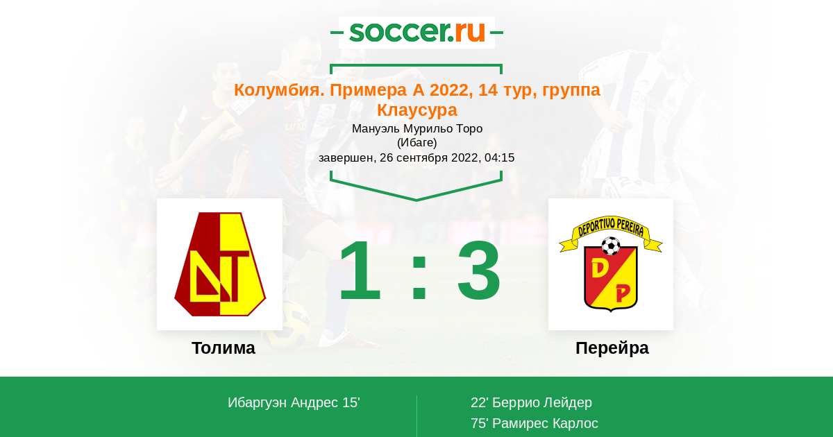 Колумбия. Примера А 03.04.2022 Перейра Логотип футбольный клуб Перейра 0:2 Логотип футбольный клуб Толима (Ибаге) Толима