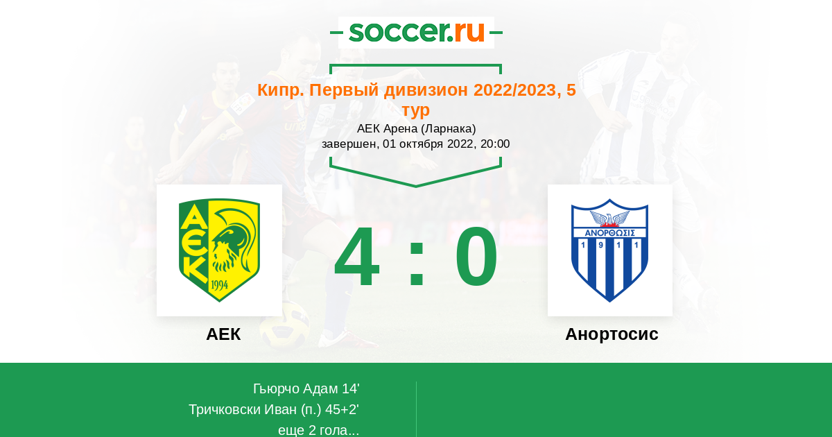 Кипр. Первый Дивизион 15.09.2014 Анортосис Логотип футбольный клуб Анортосис (Ларнака) 2:1 Логотип футбольный клуб АЕК (Ларнака) АЕК