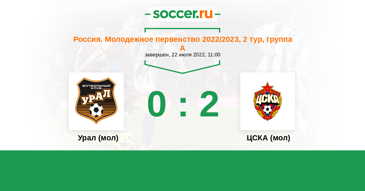 Россия. Премьер-Лига U21 16.09.2022 ЦСКА (мол) Логотип футбольный клуб ЦСКА (мол) (Москва) 1:1 Логотип футбольный клуб Урал (мол) (Екатеринбург) Урал (мол)
