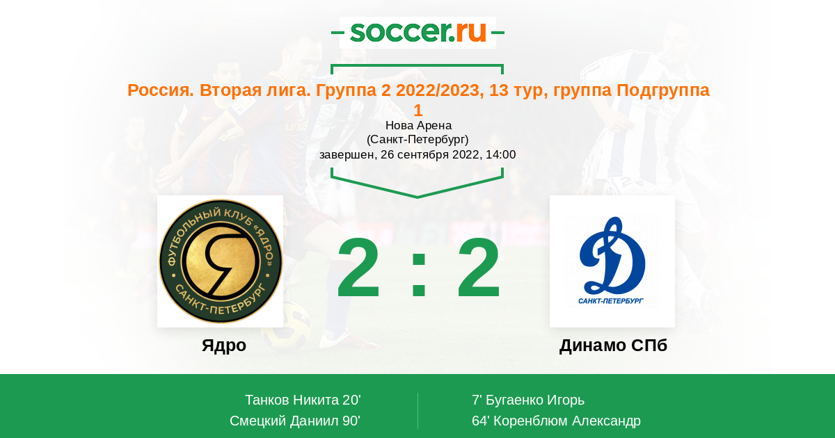 Россия. Вторая лига. Группа 2 31.07.2022 Динамо СПб Логотип футбольный клуб Динамо СПб (Санкт-Петербург) 1:0 Логотип футбольный клуб Ядро (Санкт-Петербург) Ядро
