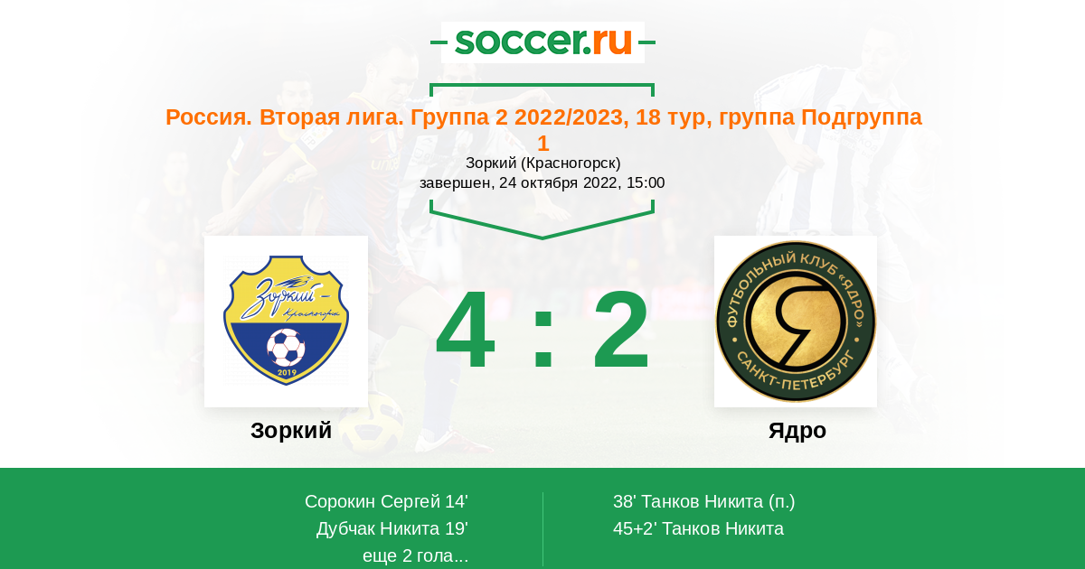 Россия. Вторая лига. Группа 2 27.08.2022 Ядро Логотип футбольный клуб Ядро (Санкт-Петербург) 2:1 Логотип футбольный клуб Зоркий (Красногорск) Зоркий