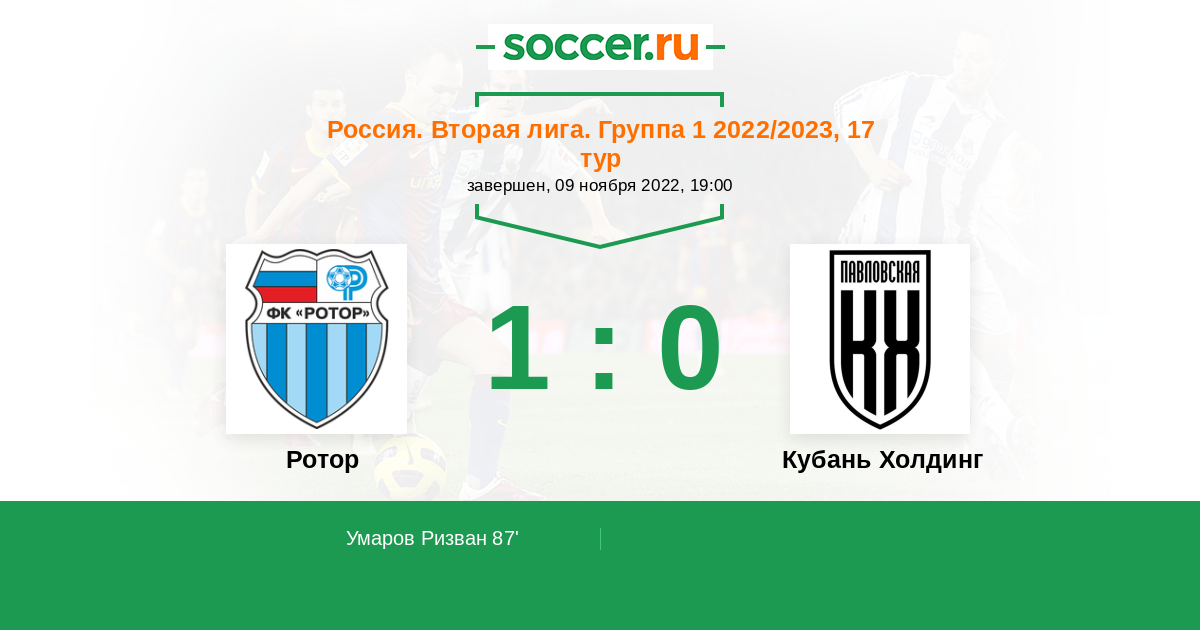 Россия. Вторая лига. Группа 1 21.08.2022 Кубань Холдинг Логотип футбольный клуб Кубань Холдинг (Павловская) 1:5 Логотип футбольный клуб Ротор (Волгоград) Ротор