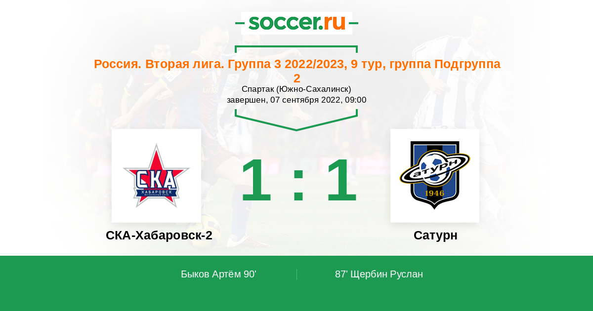 Россия. Вторая лига. Группа 3 02.10.2022 Сатурн Логотип футбольный клуб Сатурн (Раменское) 0:1 Логотип футбольный клуб СКА-Хабаровск-2 СКА-Хабаровск-2