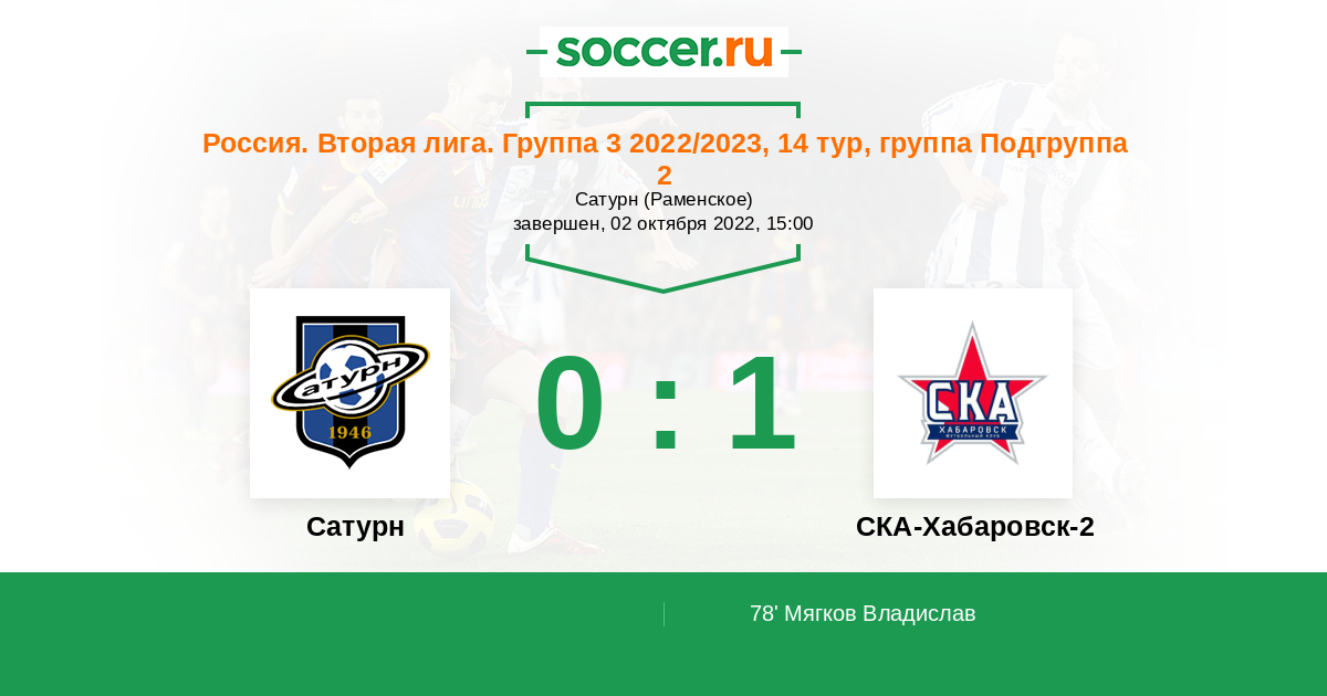 Россия. Вторая лига. Группа 3 07.09.2022 СКА-Хабаровск-2 Логотип футбольный клуб СКА-Хабаровск-2 1:1 Логотип футбольный клуб Сатурн (Раменское) Сатурн