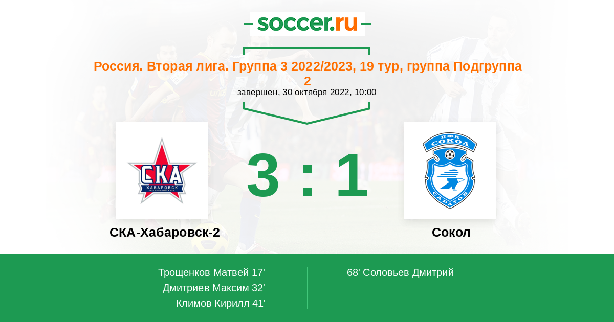 Россия. Вторая лига. Группа 3 17.04.2022 СКА-Хабаровск-2 Логотип футбольный клуб СКА-Хабаровск-2 0:1 Логотип футбольный клуб Сокол (Саратов) Сокол