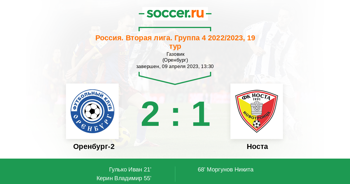 Россия. Вторая лига. Дивизион «Б». Группа 4 13.08.2023 Носта Логотип футбольный клуб Носта (Новотроицк) 1:1 Логотип футбольный клуб Оренбург-2 Оренбург-2