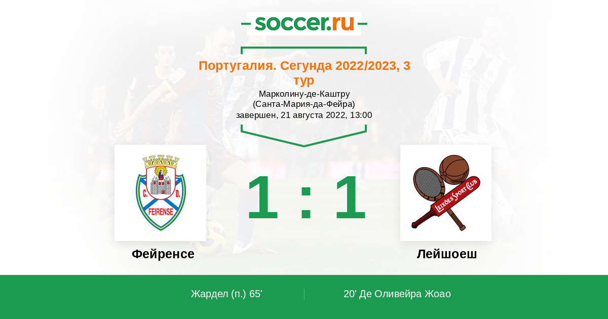 Португалия. Второй дивизион 23.09.2006 Лейшоеш Логотип футбольный клуб Лейшоеш (Матозиньюш) 1:1 Логотип футбольный клуб Фейренсе (Санта-Мария-да-Фейра) Фейренсе