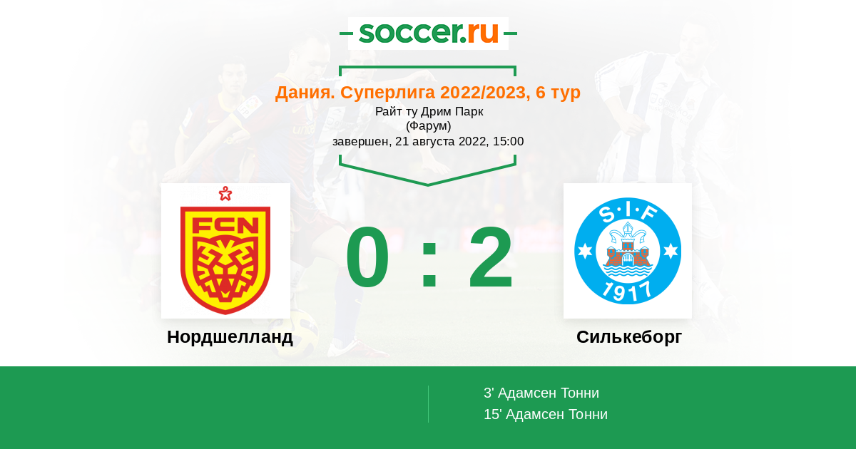 Дания. Суперлига 20.08.2023 Силькеборг Логотип футбольный клуб Силькеборг 2:0 Логотип футбольный клуб Нордшелланд (Фарум) Нордшелланд
