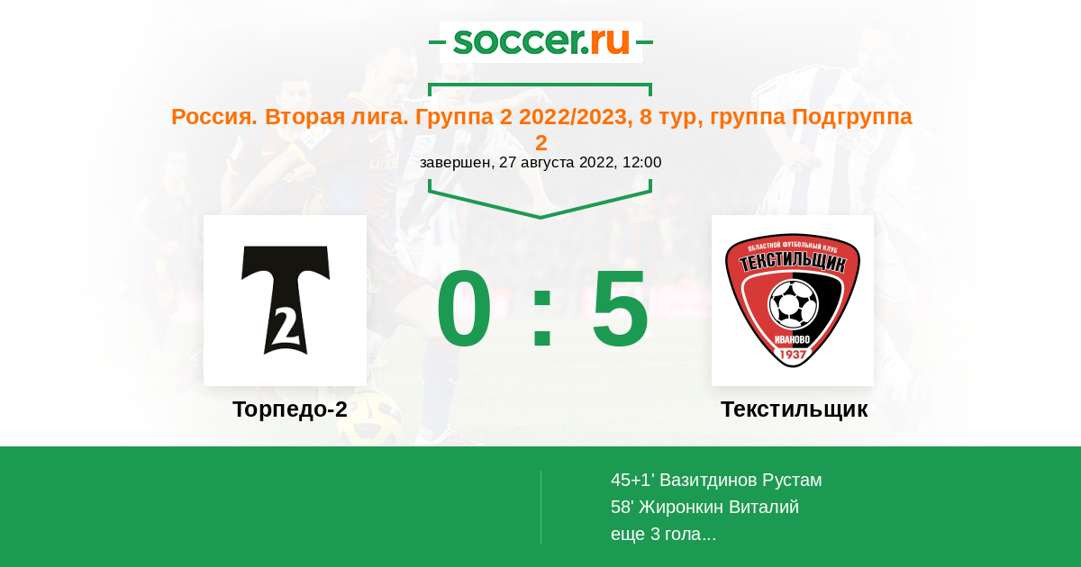 Россия. Вторая лига. Группа 2 24.10.2022 Текстильщик Логотип футбольный клуб Текстильщик (Иваново) 0:0 Логотип футбольный клуб Торпедо-2 (Москва) Торпедо-2