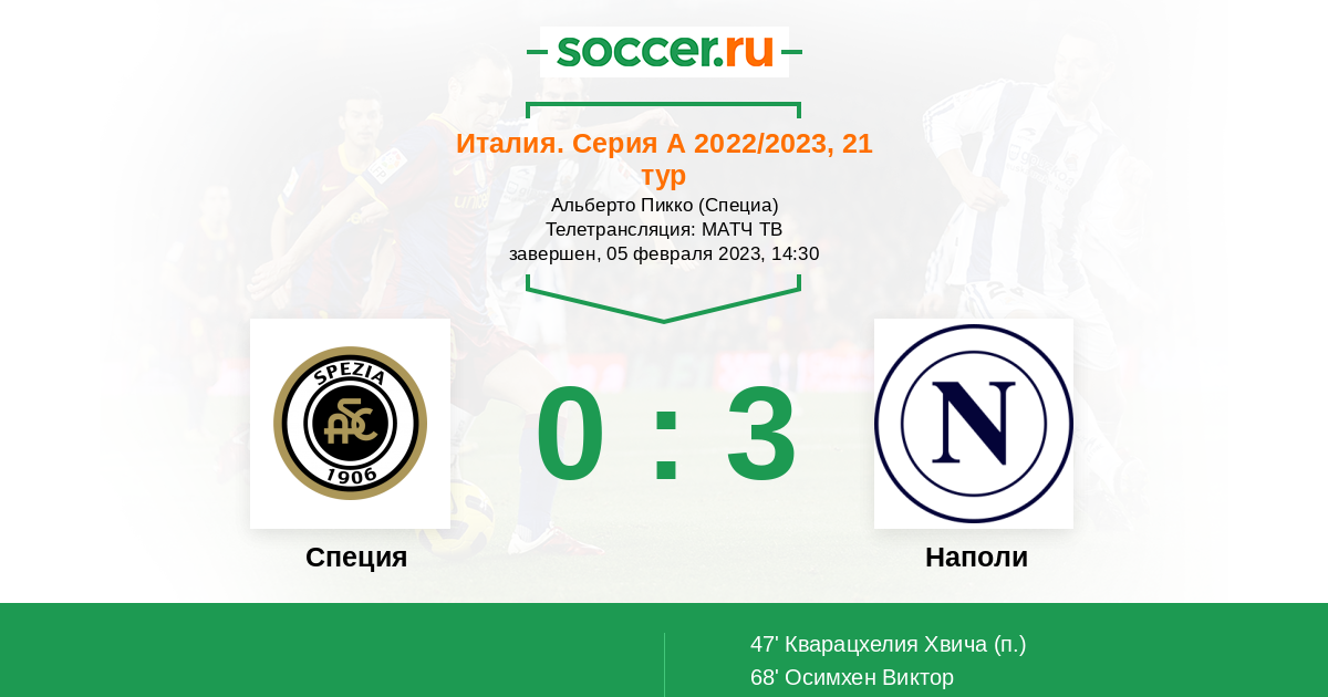 Я думаю что в этом противостоянии более чем явным фаворитом на победу является команда гостей Наполи . Команда хозяев поля Специя находится внизу турнирной таблицы , к тому же у неё есть большие проблемы с составом и наврядли она сможет хоть что-то противопоставить команде гостей . Дежурные 0:3 !)