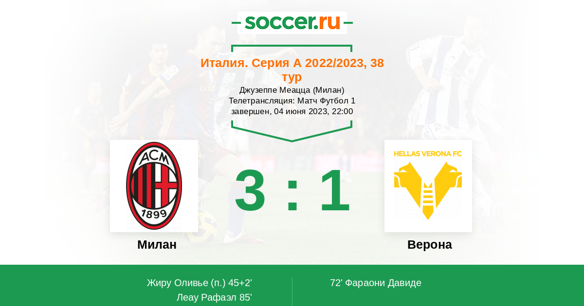 Италия. Серия А 23.09.2023 Милан Логотип футбольный клуб Милан 1:0 Логотип футбольный клуб Верона Верона