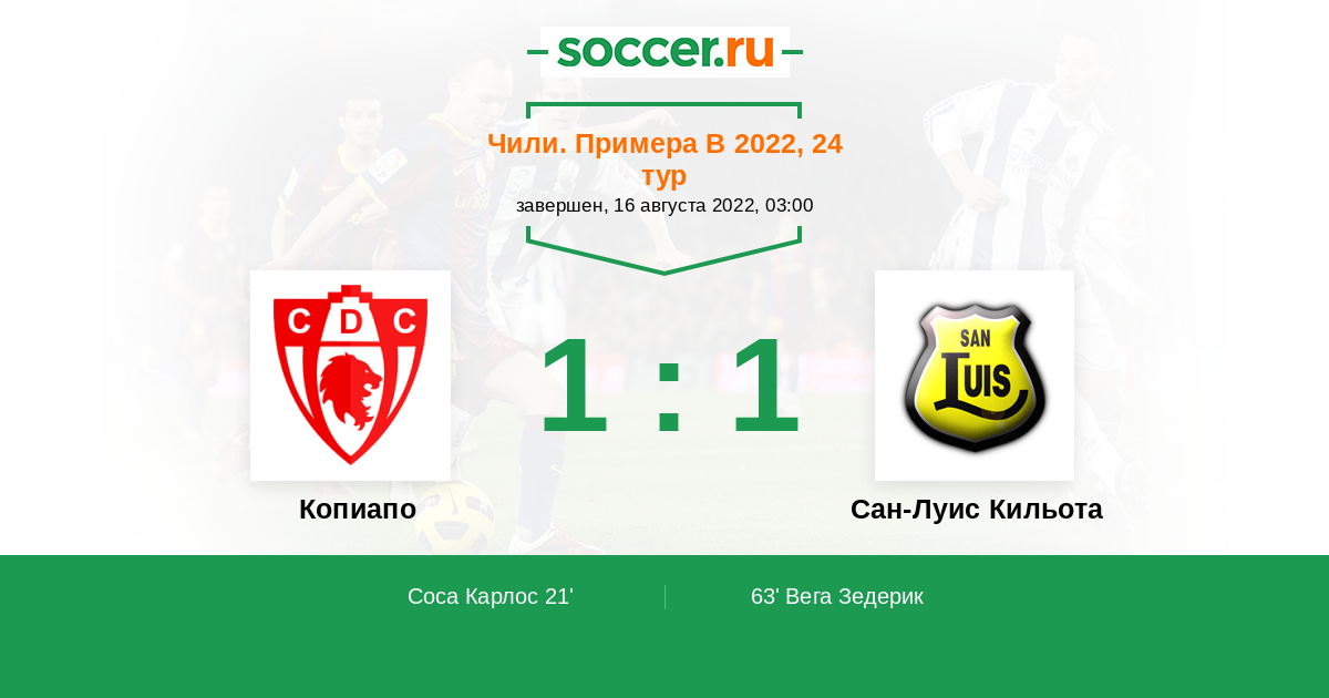 Чили. Примера В 19.10.2014 Копиапо Логотип футбольный клуб Копиапо 2:3 Логотип футбольный клуб Сан-Луис Кильота Сан-Луис Кильота