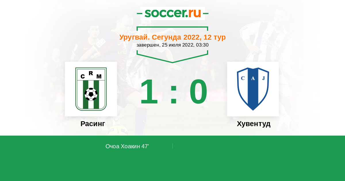 Уругвай. Сегунда 30.04.2022 Хувентуд Логотип футбольный клуб Хувентуд (Лас-Пьедрас) 0:2 Логотип футбольный клуб Расинг (Монтевидео) Расинг