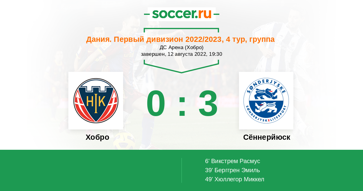 Дания. Первый дивизион 28.08.2023 Хобро Логотип футбольный клуб Хобро 1:2 Логотип футбольный клуб Сённерйюск (Хадерслев) Сённерйюск