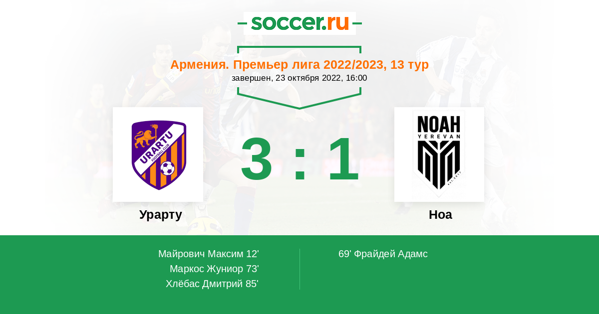 Армения. Премьер-лига 21.10.2023 Урарту Логотип футбольный клуб Урарту (Ереван) 1:0 Логотип футбольный клуб Ноа (Ереван) Ноа