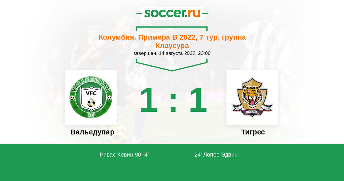 Колумбия. Примера B 26.08.2019 Тигрес Логотип футбольный клуб Тигрес (Сипакира) 1:2 Логотип футбольный клуб Вальедупар Вальедупар