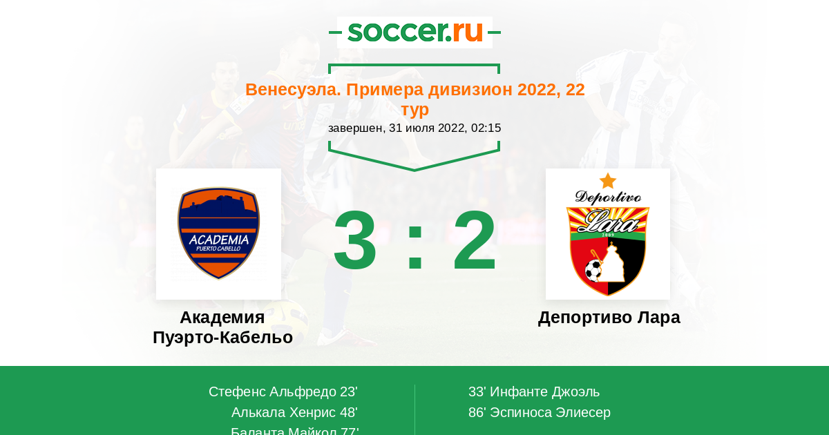 Венесуэла. Примера дивизион 24.04.2022 Депортиво Лара Логотип Депортиво Лара (Баркисимето) 1:2 Логотип футбольный клуб Пуэрто-Кабельо Пуэрто-Кабельо