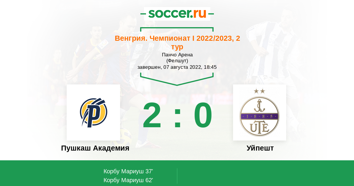 Венгрия. Чемпионат 1 05.03.2022 Уйпешт Логотип футбольный клуб Уйпешт (Будапешт) 2:1 Логотип футбольный клуб Пушкаш Академия (Фелксут) Пушкаш Академия