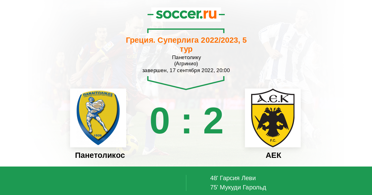 Греция. Суперлига 15.01.2023 АЕК Логотип футбольный клуб АЕК (Афины) 4:1 Логотип футбольный клуб Панетоликос (Агринио) Панетоликос