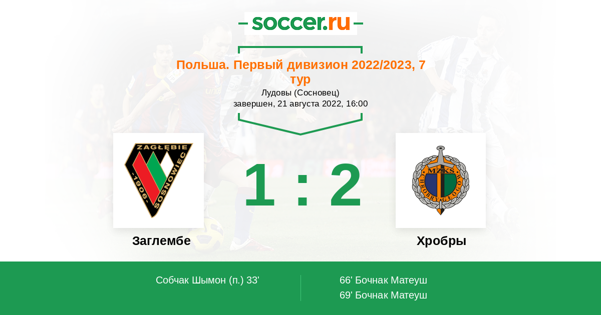 Польша. Первый дивизион 24.11.2021 Заглембе Логотип футбольный клуб Заглембе (Сосновец) 3:2 Логотип футбольный клуб Хробры (Глогув) Хробры