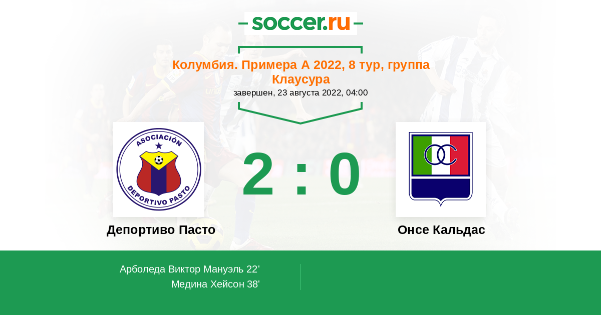 Колумбия. Примера А 23.02.2022 Онсе Кальдас Логотип футбольный клуб Онсе Кальдас (Манисалес) 3:0 Логотип футбольный клуб Депортиво Пасто Депортиво Пасто