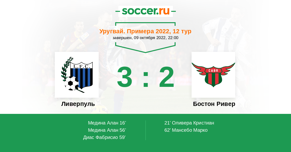 Уругвай. Примера A 11.10.2020 Ливерпуль Логотип футбольный клуб Ливерпуль (Монтевидео) 3:2 Логотип футбольный клуб Бостон Ривер (Монтевидео) Бостон Ривер