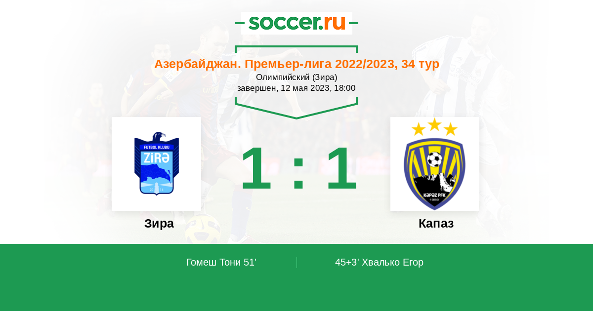 Азербайджан. Премьер-Лига 18.05.2024 Капаз Логотип футбольный клуб Капаз (Гянджа) 0:1 Логотип футбольный клуб Зира Зира