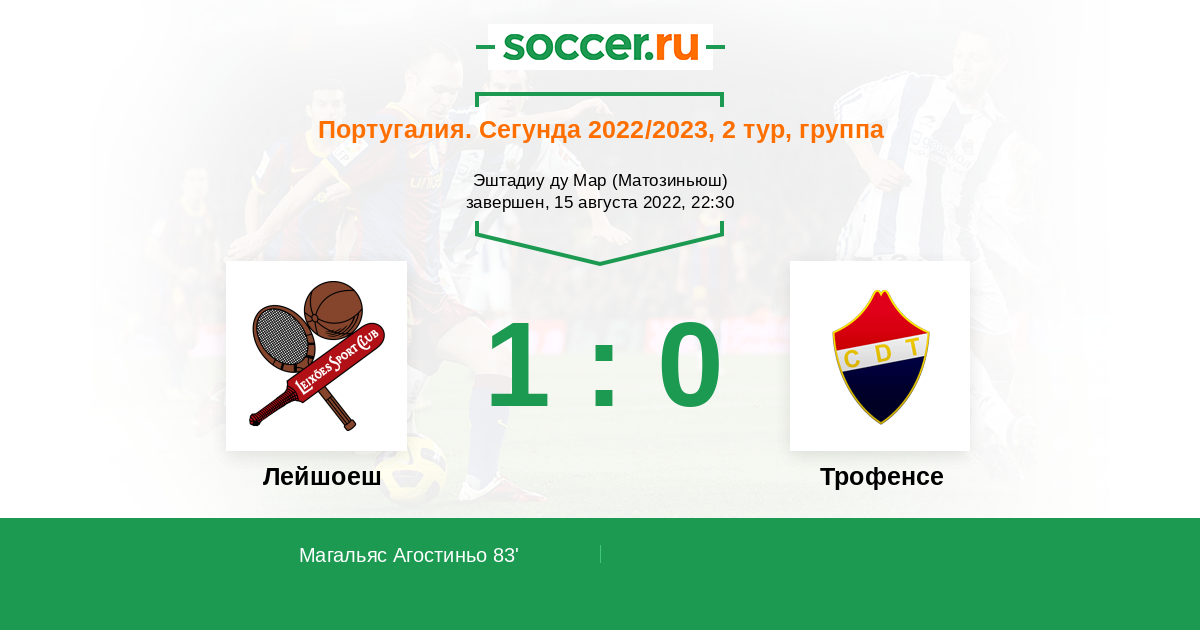 Португалия. Сегунда 28.11.2021 Лейшоеш Логотип футбольный клуб Лейшоеш (Матозиньюш) 1:2 Логотип футбольный клуб Трофенсе (Трофа) Трофенсе