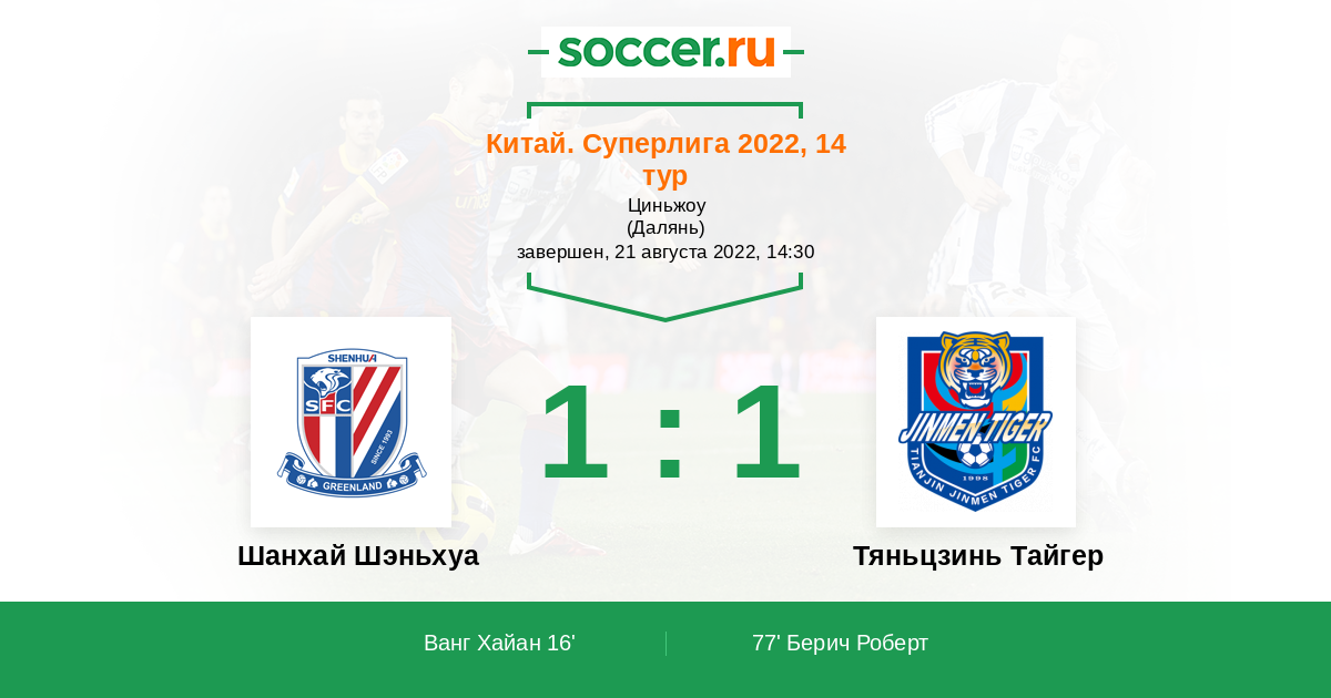 Китай. Суперлига 22.07.2021 Тяньцзинь Тайгер Логотип футбольный клуб Тяньцзинь Тайгер 1:3 Логотип футбольный клуб Шанхай Шэньхуа Шанхай Шэньхуа