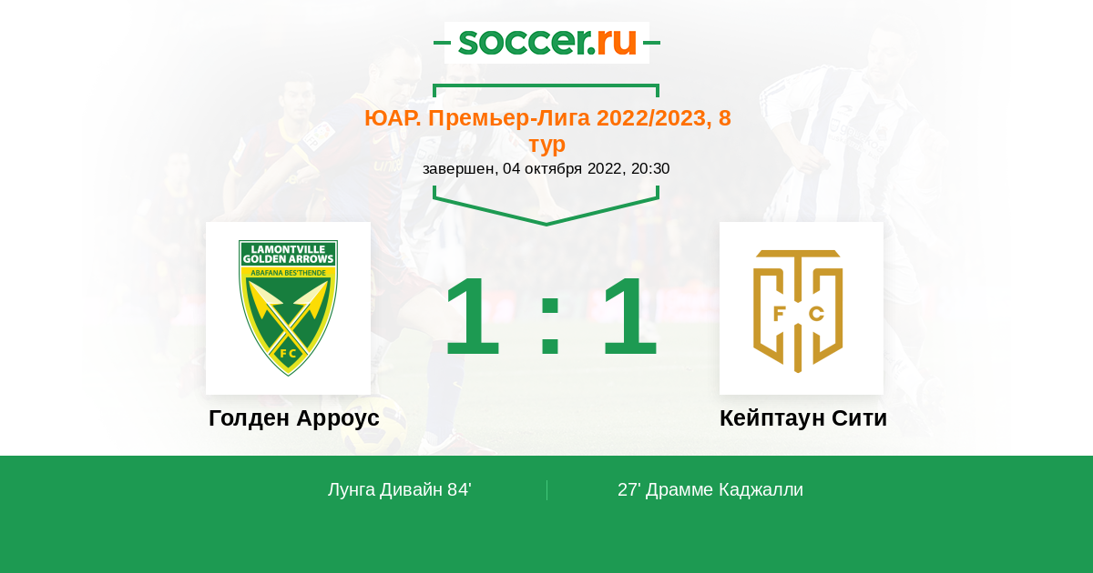 ЮАР. Премьер-Лига 23.09.2015 Голден Арроус Логотип футбольный клуб Голден Арроус (Дурбан) 1:2 Логотип футбольный клуб Кейптаун Сити Кейптаун Сити
