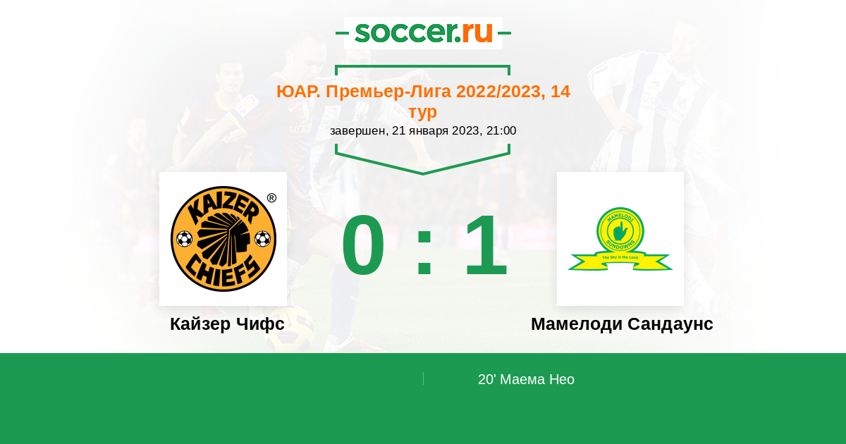 ЮАР. Премьер-Лига 05.01.2019 Кайзер Чифс Логотип футбольный клуб Кайзер Чифс (Йоханнесбург) 1:2 Логотип футбольный клуб Мамелоди Сандаунс (Претория) Мамелоди Сандаунс