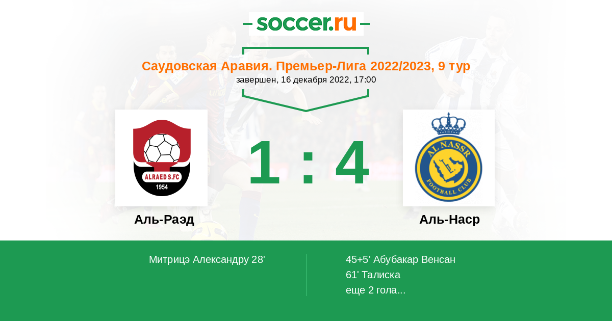 Саудовская Аравия. Премьер-Лига 17.11.2017 Аль-Раэд Логотип футбольный клуб Аль-Раэд (Бурайда) 0:5 Логотип футбольный клуб Аль-Наср (Эр-Рияд) Аль-Наср