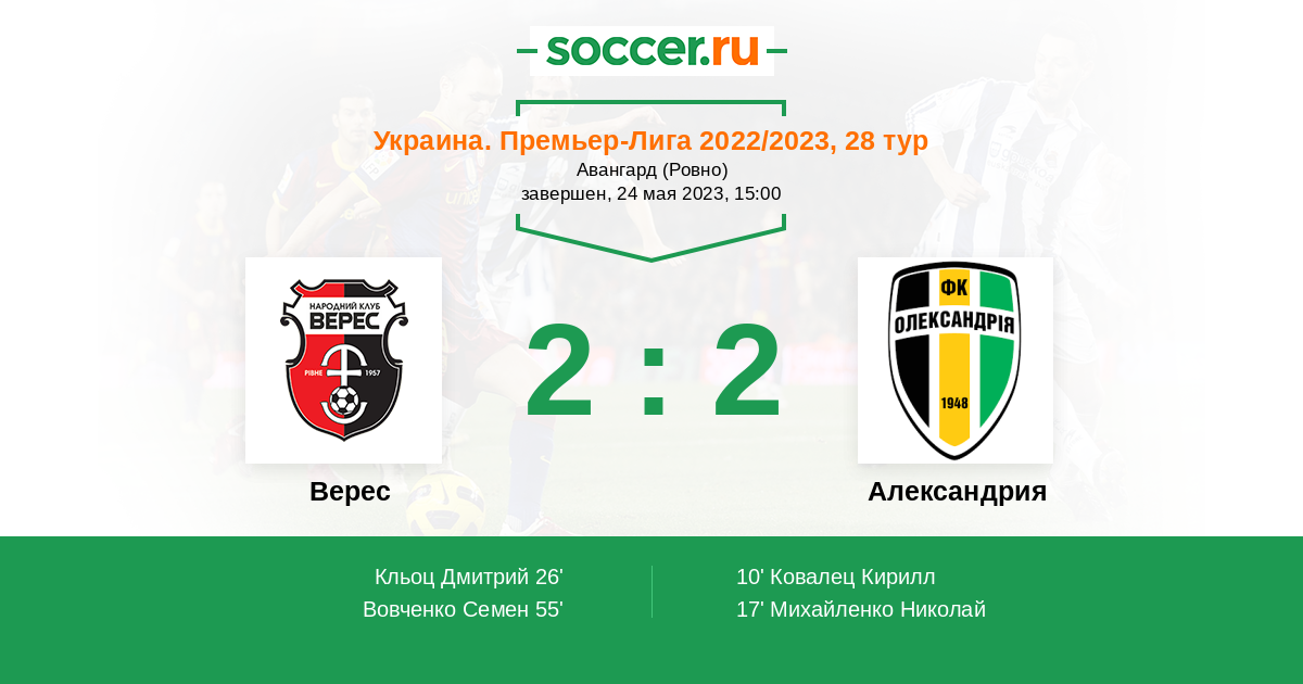 В данном противостоянии Верес одержит убедительную ничью и поправит свои плачевные дела в чемпионате независимой. Тем более Александрии ничего не светит, Лигу Конференций им не видать как своих ушей...