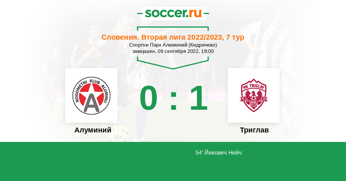 Словения. Первая Лига 22.07.2012 Триглав Логотип футбольный клуб Триглав (Крань) 1:0 Логотип футбольный клуб Алуминий (Кидричево) Алуминий