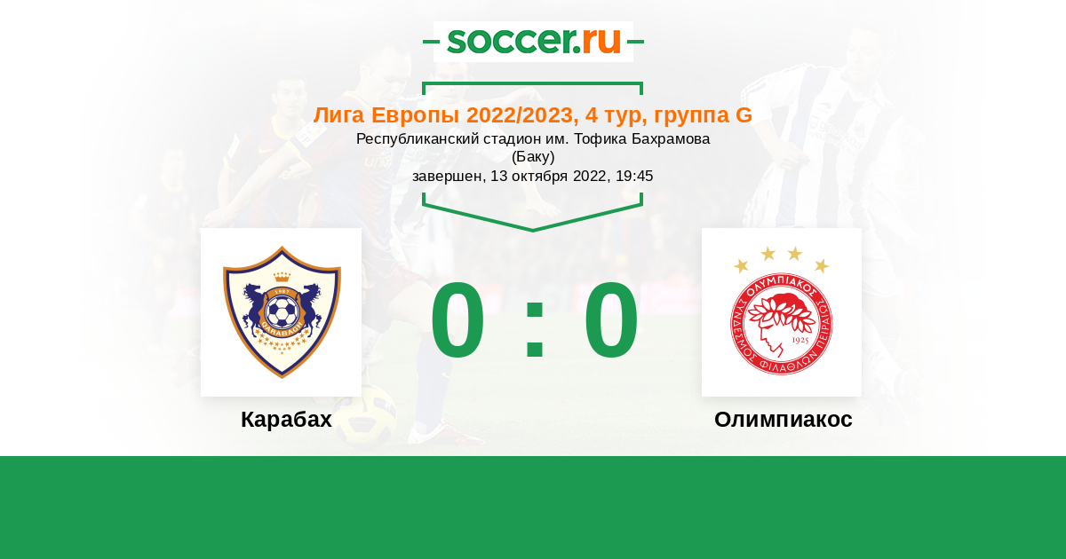 Вот это да...че ж Карабах дома ничего и не смог сделать с Олимпиакосом...Карабаху повезло что ведушие игроки Олимпиакоса все трамвированы...У Карабаха ситуация сложная...