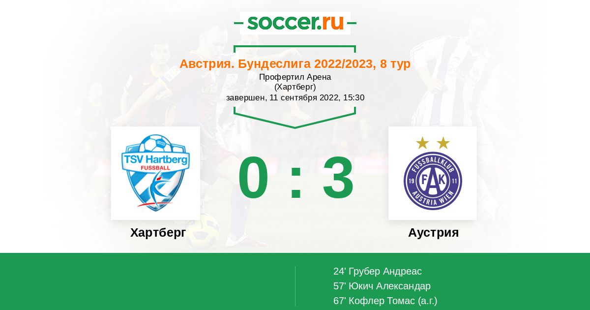 Австрия. Бундеслига 17.09.2023 Хартберг Логотип футбольный клуб Хартберг 2:1 Логотип футбольный клуб Аустрия (Вена) Аустрия