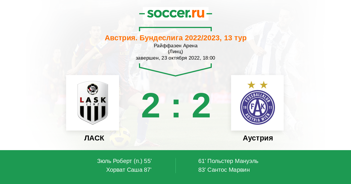 Австрия. Бундеслига 02.04.2023 Аустрия Логотип футбольный клуб Аустрия (Вена) 2:2 Логотип футбольный клуб ЛАСК (Линц) ЛАСК