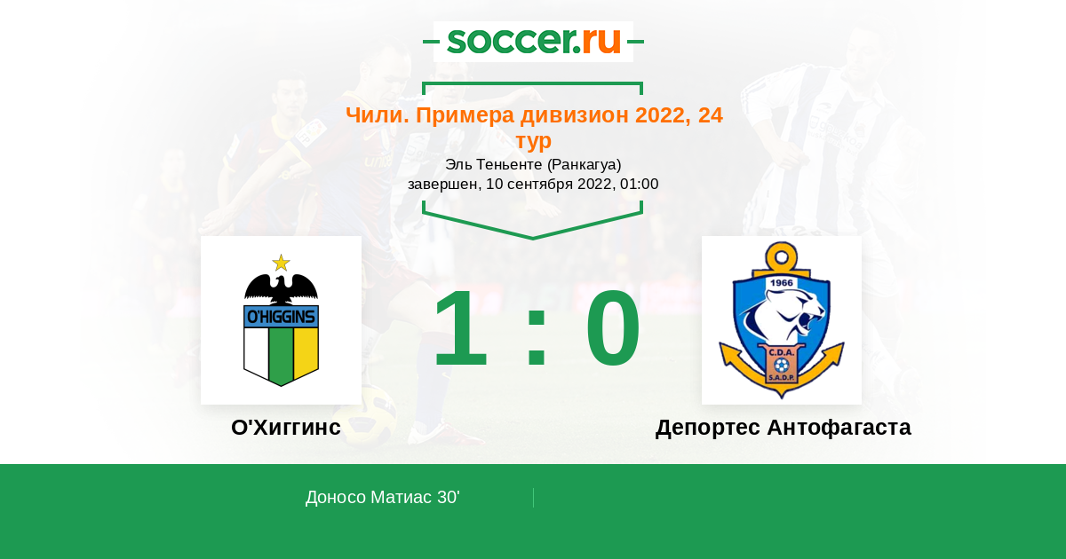 Чили. Примера дивизион 30.04.2022 Депортес Антофагаста Логотип футбольный клуб Депортес Антофагаста 1:0 Логотип футбольный клуб О'Хиггинс (Ранкагуа) О'Хиггинс