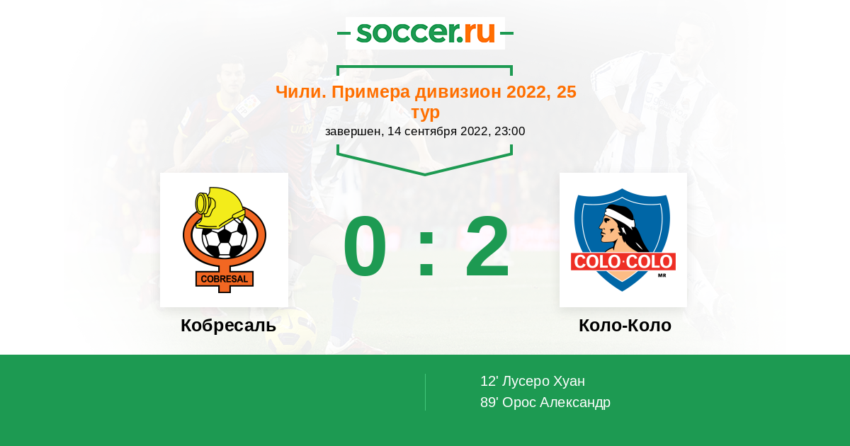 Чили. Примера дивизион 23.09.2023 Коло-Коло Логотип футбольный клуб Коло-Коло (Сантьяго) 6:0 Логотип футбольный клуб Кобресаль (Эль-Сальвадор) Кобресаль