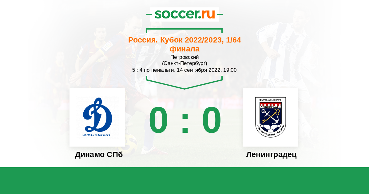 Россия. Вторая лига. Группа 2 10.09.2022 Динамо СПб Логотип футбольный клуб Динамо СПб (Санкт-Петербург) 0:2 Логотип футбольный клуб Ленинградец (Ленинградская обл.) Ленинградец