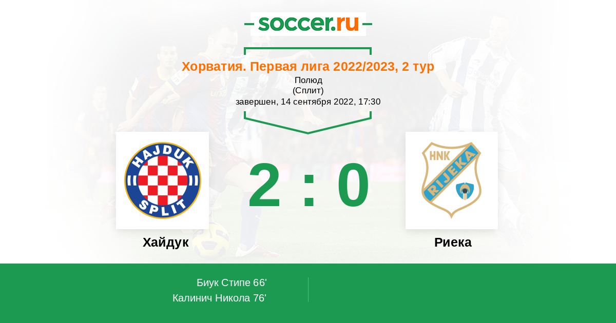 Хорватия. Первая лига 17.09.2017 Хайдук Логотип футбольный клуб Хайдук (Сплит) 0:2 Логотип футбольный клуб Риека Риека